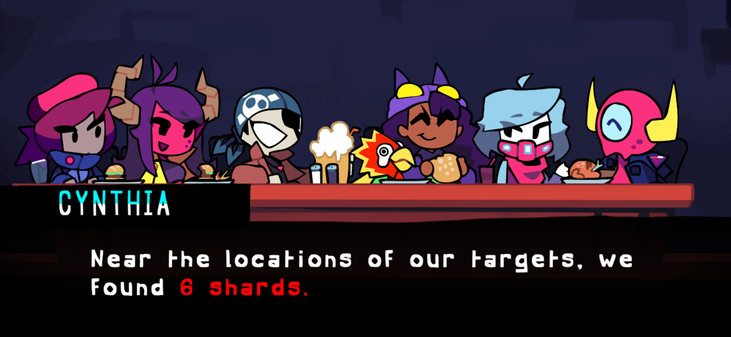 Contract Rush DX came out on July 30, 2025, so it’s brand new. It was created by a two-person team, one programmer, and one artist + musician. The game plays like Mega Man meets Contra. It’s very adorable - the visuals were definitely a selling point. Here’s the cast enjoying dinner together.