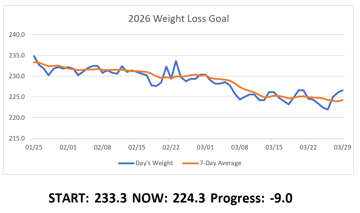 The modest weight loss of 2026 is still going strong. Our seven-day average weight dropped by 0.7 last week, bringing us to an even nine pounds lost over our nine weeks of consistent effort. Here’s the data: