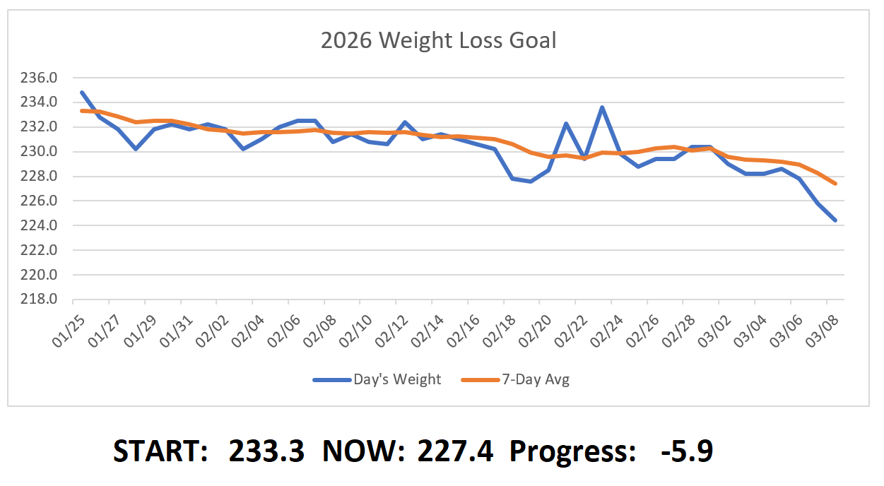 I had my best week of 2026’s Project Weight Loss. Regular readers of the blog will remember that last week I was complaining about how I walked over 40 miles in the span of four days and saw zero change whatsoever on the scale.